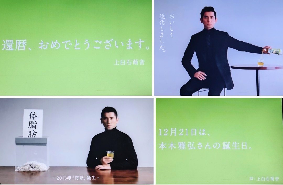 M-1のプレミアムスポンサーであるSUNTORYだが、M-1真裏のイッテQと最強スポーツ男子(日曜劇場セールス枠)で流れた「12月21日は本木雅弘さん還暦の誕生日」という還暦お祝いの60秒CMがまた素晴らしかった。2013年から現在まで本木さんが出演した「特茶」の様々なCMシーンをまとめたものだ。12年変わらず若々しさを保ち続けている本木さんの凄さを実感した60秒、60歳おめでとうございます
